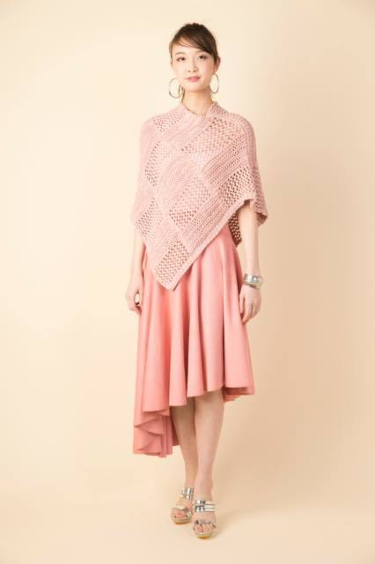 フェミニンなベージュピンクのパッチワークポンチョと、女性らしい柔らかな素材と色合いがキュートなフィッシュテールスカートのアンサンブルです。