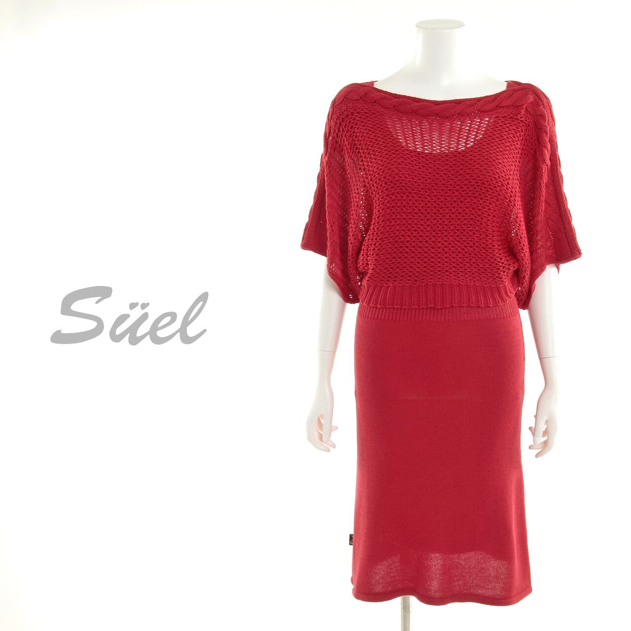 ケーブルニットトップス五分袖+ニットワンピース半袖 セットアップ レッド